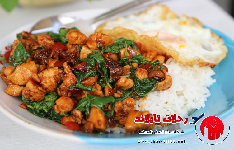 تقدم في منطقة مركز تايلاند وتحوي الأرز المطبوخ مع شرائح لحوم الدجاج وصلصة الفليفلة الحمراء الحارة وأوراق الريحان الخضراء المفرومة وشرائح الليمون.