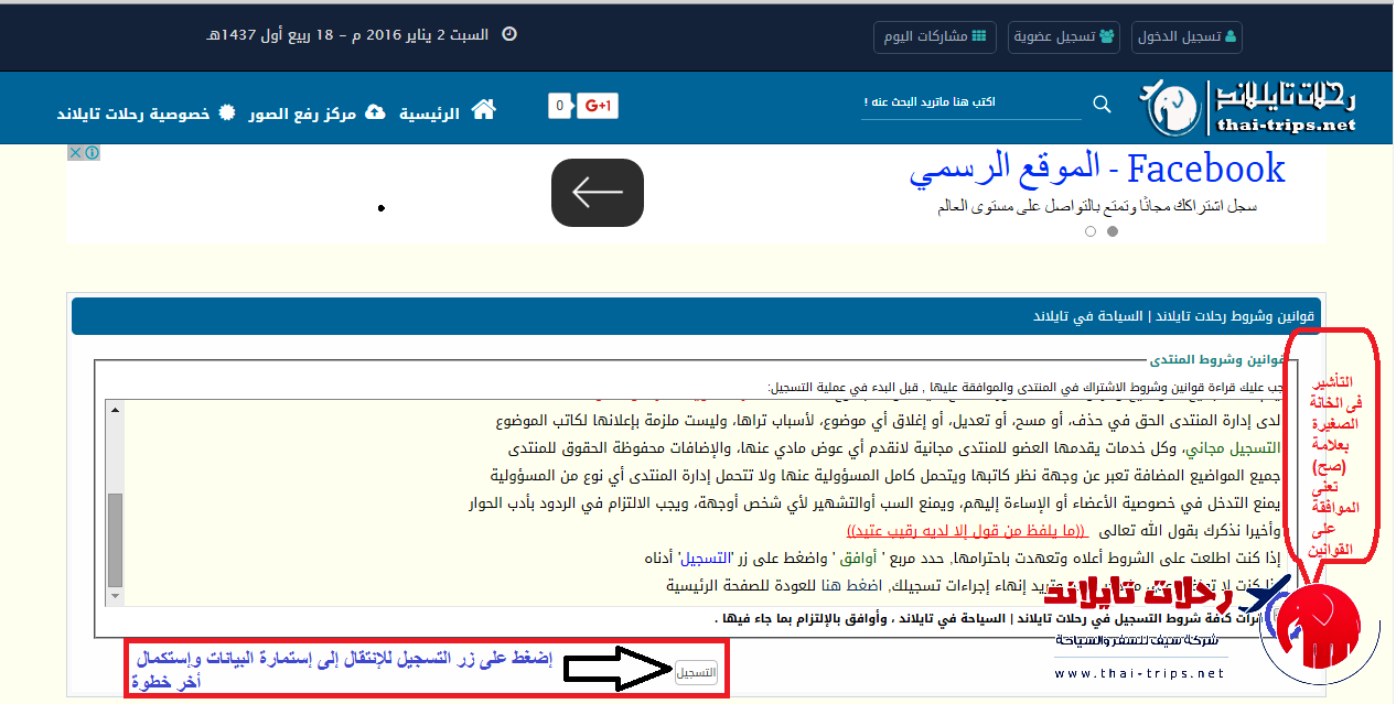ثانيا : بعد الضغط على تسجيل سيتم تحويلك إلى لبصفحة التاليه (شروط وقوانين المنتدي) - فضلا ضع تأشير (صح) تفيد بالموافقة ومن ثم إضغط على زر ( التسجيل) كما هو موضح بالصورة التاليه :