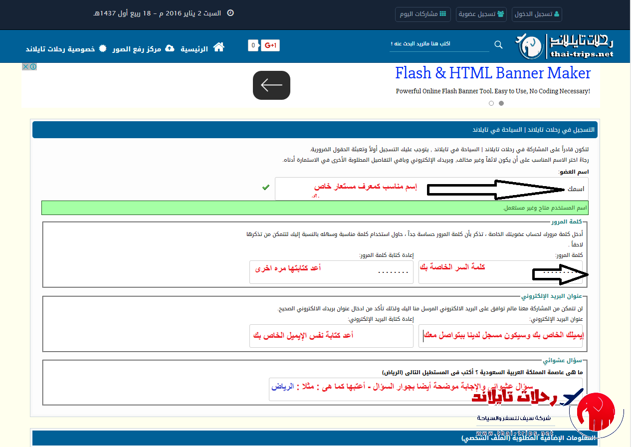 ثالثا : سيتم إنتقالك إلى إستمارة ملئ بياناتك الخاصة - ستقوم وضع إسمك المستعار أو ( حسب رغبتك) وكلمة السر والإيميل والإجابة على السؤال العشوائى كما هو بالصورة التاليه :