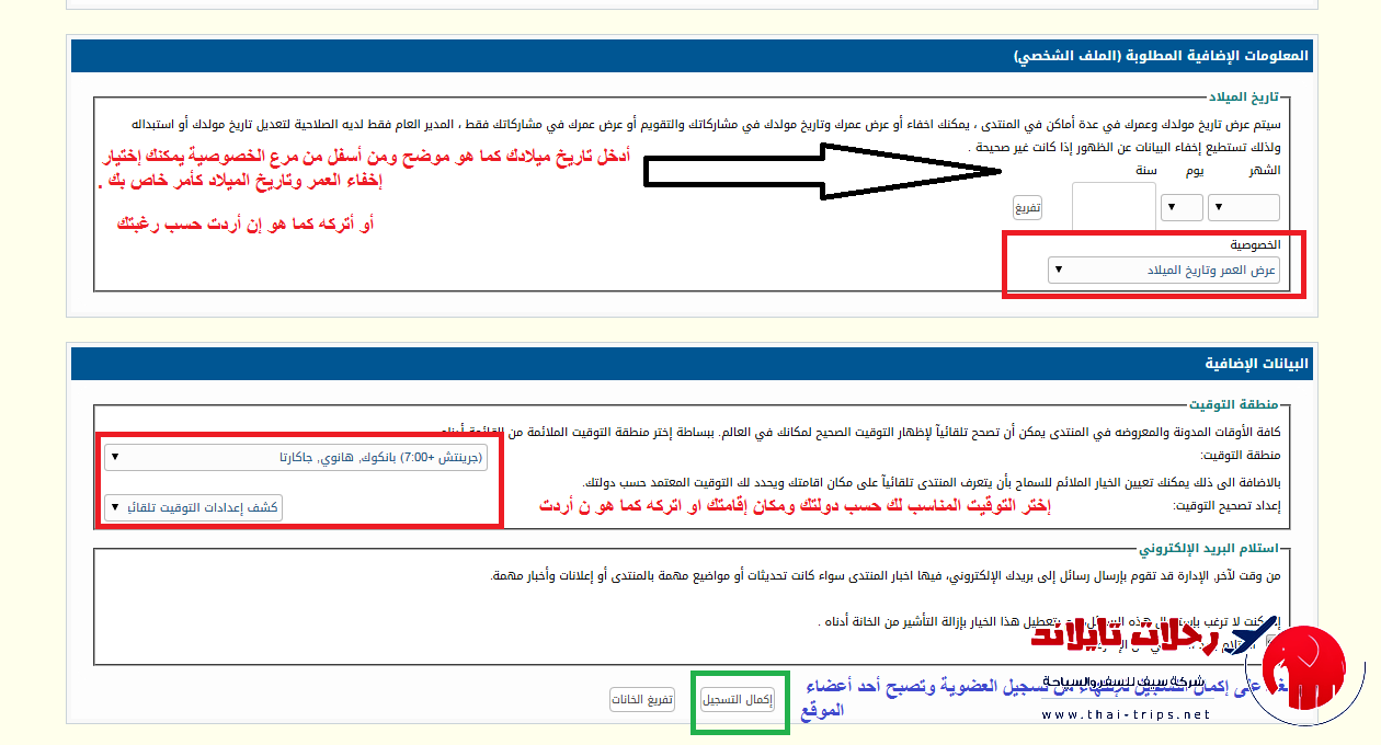إستكمالا لملئ باقى البيانات : سضع تاريخ ميلادك ولك الحق فى (إخفاؤه) كأمر خاص بك - وإختيار توقيت بلدك ومن ثم بأسفل ستجد زر (إكمال التسجيل) فضلا إضغط عليه كما هو موضح بالصورة التاليه :