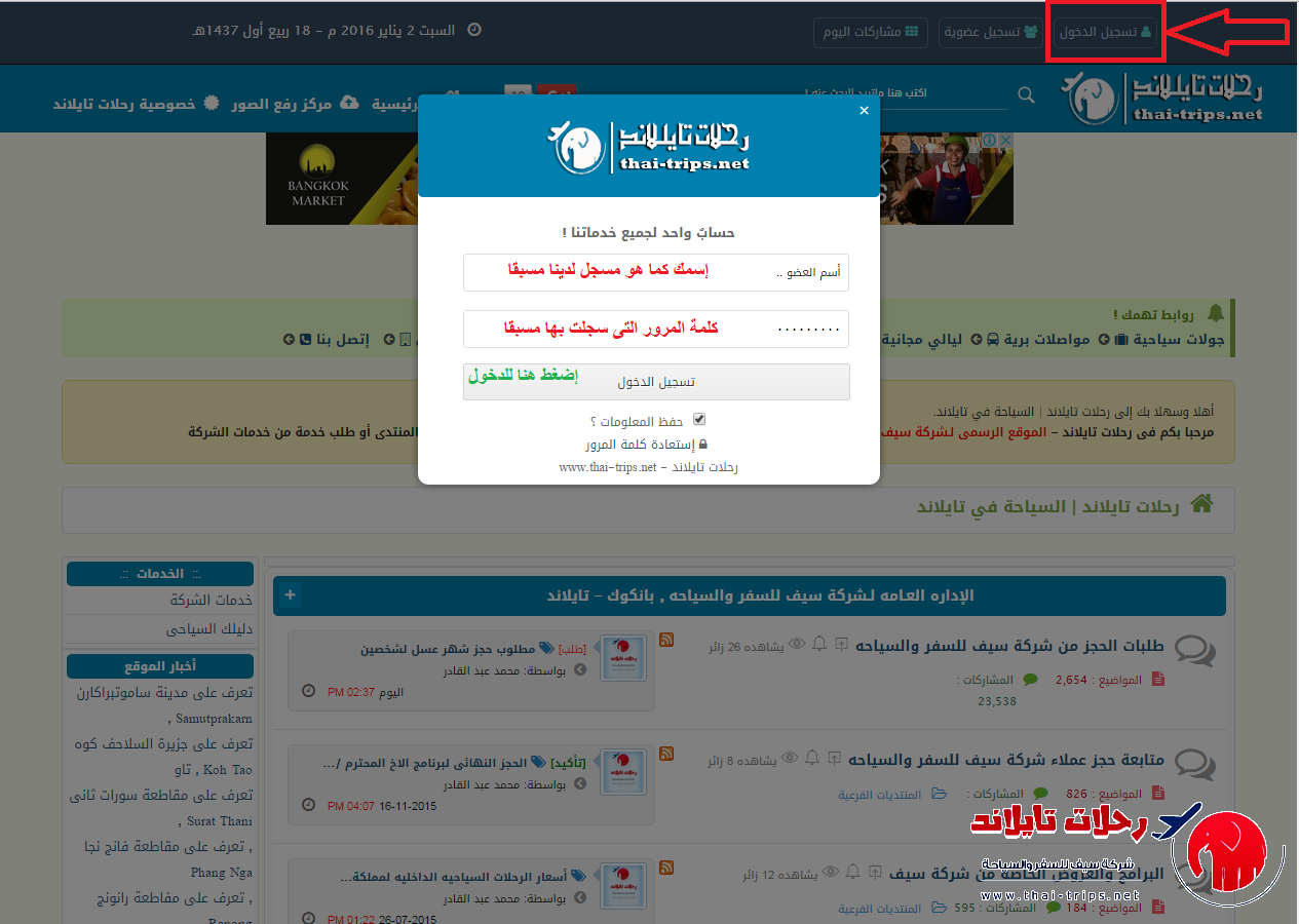 - فى حالة دخولك مرة اخرى للموقع : ستجد باعلى (تسجيل دخل ) فضلا أضغط عليها وستظهر لك نافذه صغيره ستضع فيها (إسمك المسجل به لدينا + كلمة السر الخاصة بك التى سجلت بها) - كما بالصورة التالية :