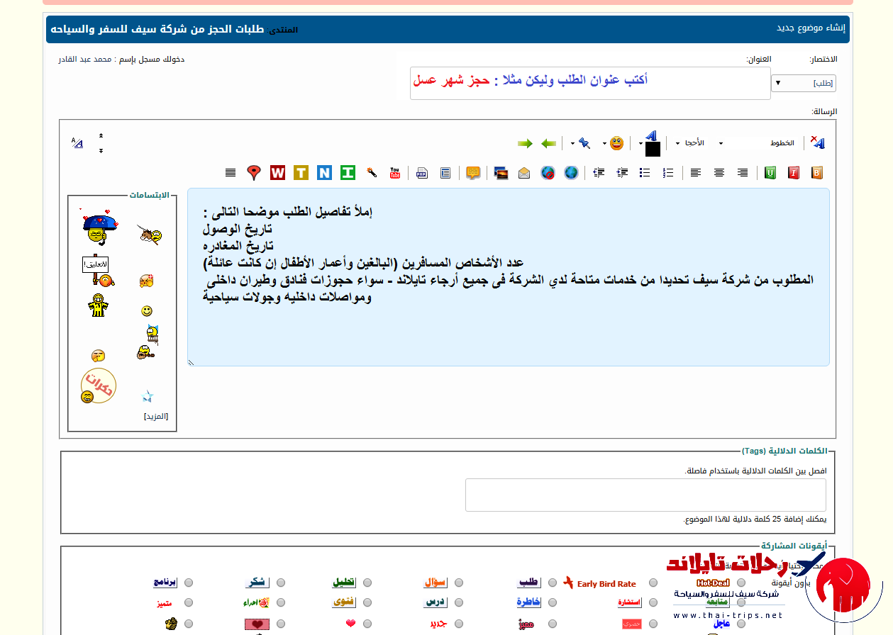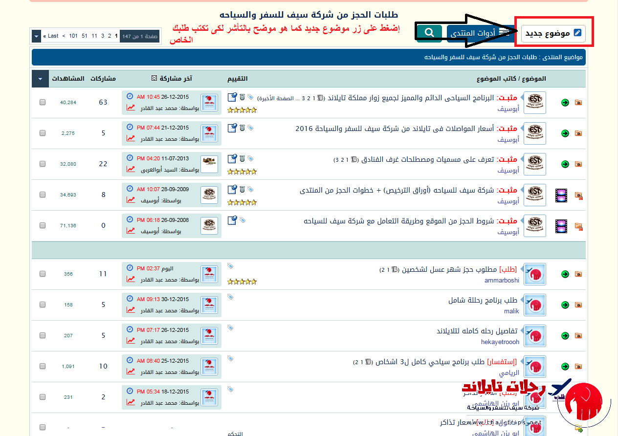 # نأتى الأن لكتابة طلبك بالموقع كونك أحد الاعضاء وتريد طلب خدمة من شركة سيف , فضلا الدخول اولا على قسم طلبات الحجز من شركة سيف للسفر والسياحه ستجد بأعلى القسم زر (موضوع جديد) فضلا إضغط عليه كما بالصورة التالية :