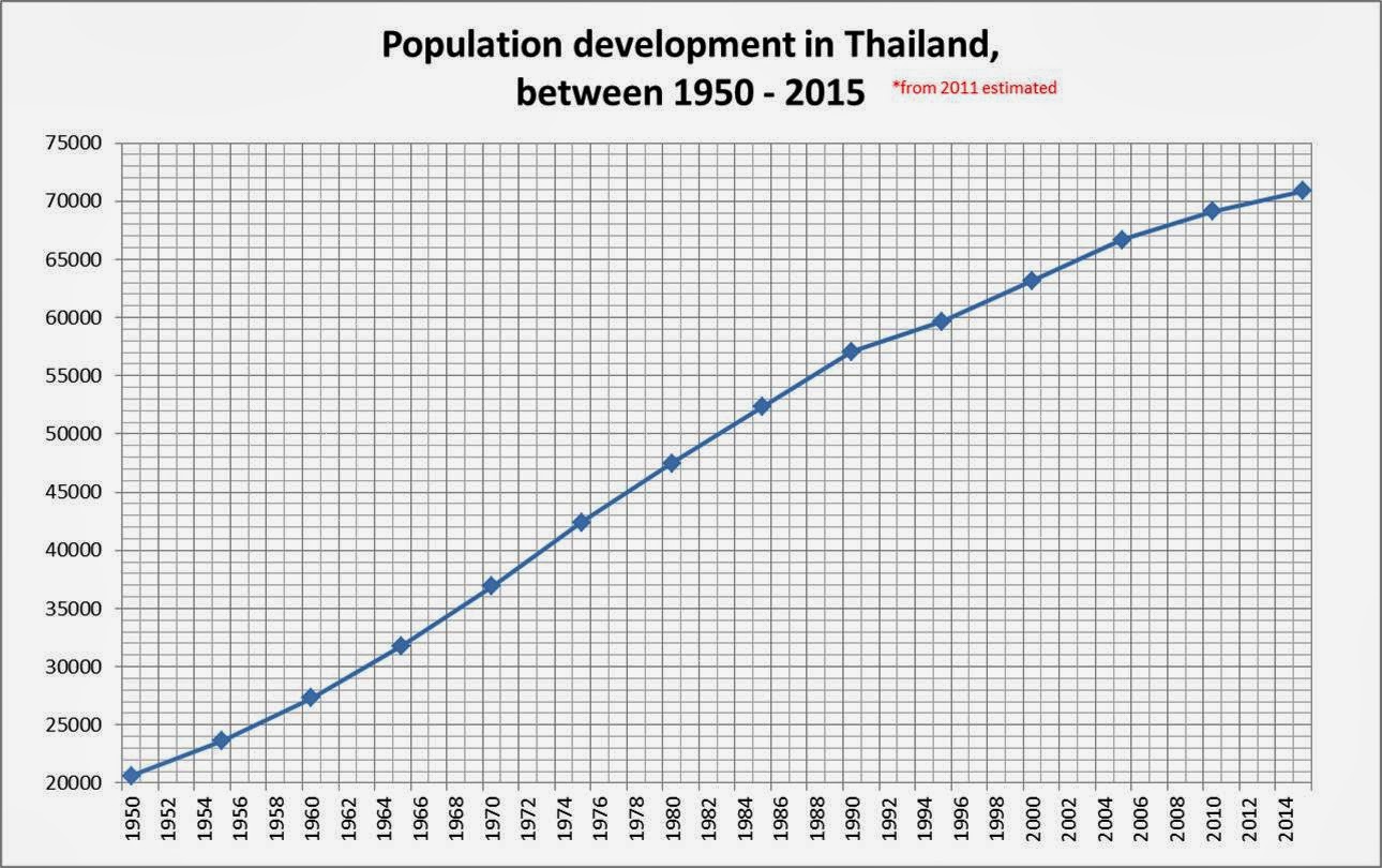 يبلغ عدد سكان ممكلة تايلاند فى وقتنا الحالى إلى 70 مليون نسمه وهم فى تزايد , الغالبيه منهم بنسبة 80 % من إجمالى عدد السكان عرقيا تايلنديين الأصل إلى جانب الأعراق الأخرى مثل الصينيه والهنديه والملايو والخمير والبورميين ممثله لكن بدرجات متفاوته وليست كثيره مثل ماليزيا والدول المجاوره .. ويعيش بالعاصمه التايلنديه بانكوك وحدها قرابة الـ 10 ملايين نسمه .